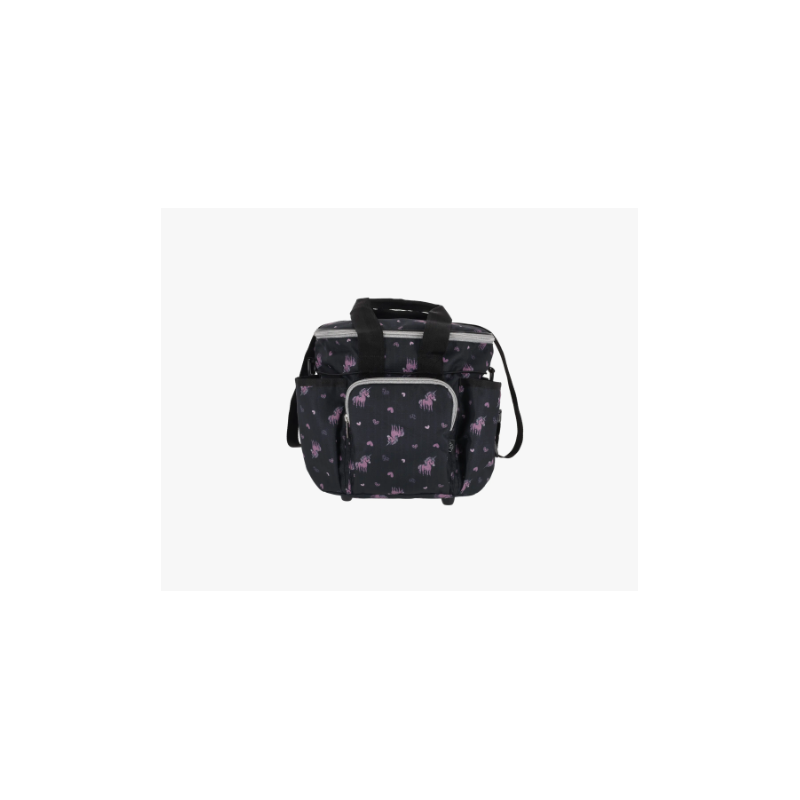 À l'intérieur, vous trouverez une poche à tirette, une poche transparente pour une carte et deux boucles pour des stylos. Plusieurs poches sont disposées tout autour du sac pour ranger des objets tels qu'une bouteille d'eau ou un spray pour votre poney. De plus, il y a une poche zippée sur le devant. Le sac est muni d'une bandoulière et de poignées pour faciliter le transport.