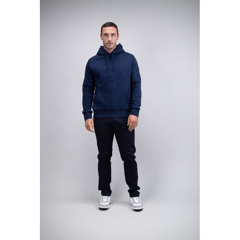 Le sweat SAMY de Harcour, à la fois douillet et design avec son intérieur doublé polaire, une poche kangourou et un logo en broderie 3D. Une pièce polyvalente, idéale pour une utilisation sportive ou stable.