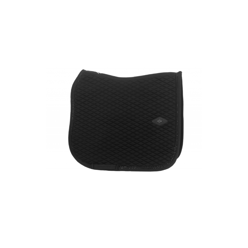 Le tapis de selle Calisson version dressage possède un fin et confortable matelassage en losange horizontal. Il est galonné d'un double rang de strass et doté d'un insert en losange glitter dans lequel on retrouve un pin's Pénélope argenté en losange 3D ton sur ton à l'intérieur.